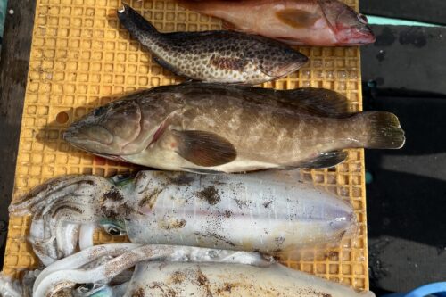 アオリイカ 25〜28cm 2杯 クエ 38cm 1尾 アカハタ30〜32cm …