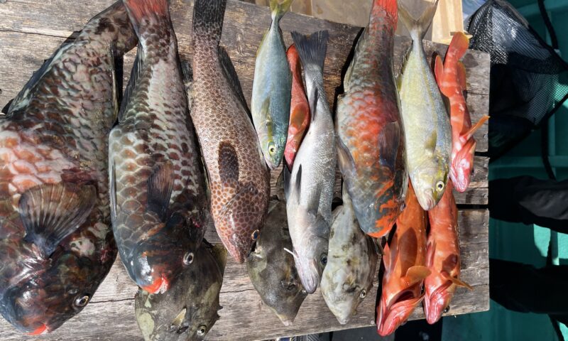 ヒラスズキ 41cm 1尾 オオモンハタ 37cm 1尾 アカハタ 28〜33cm 3尾 カワハギ 22〜25cm 3尾 カンパチ 35cm 1尾